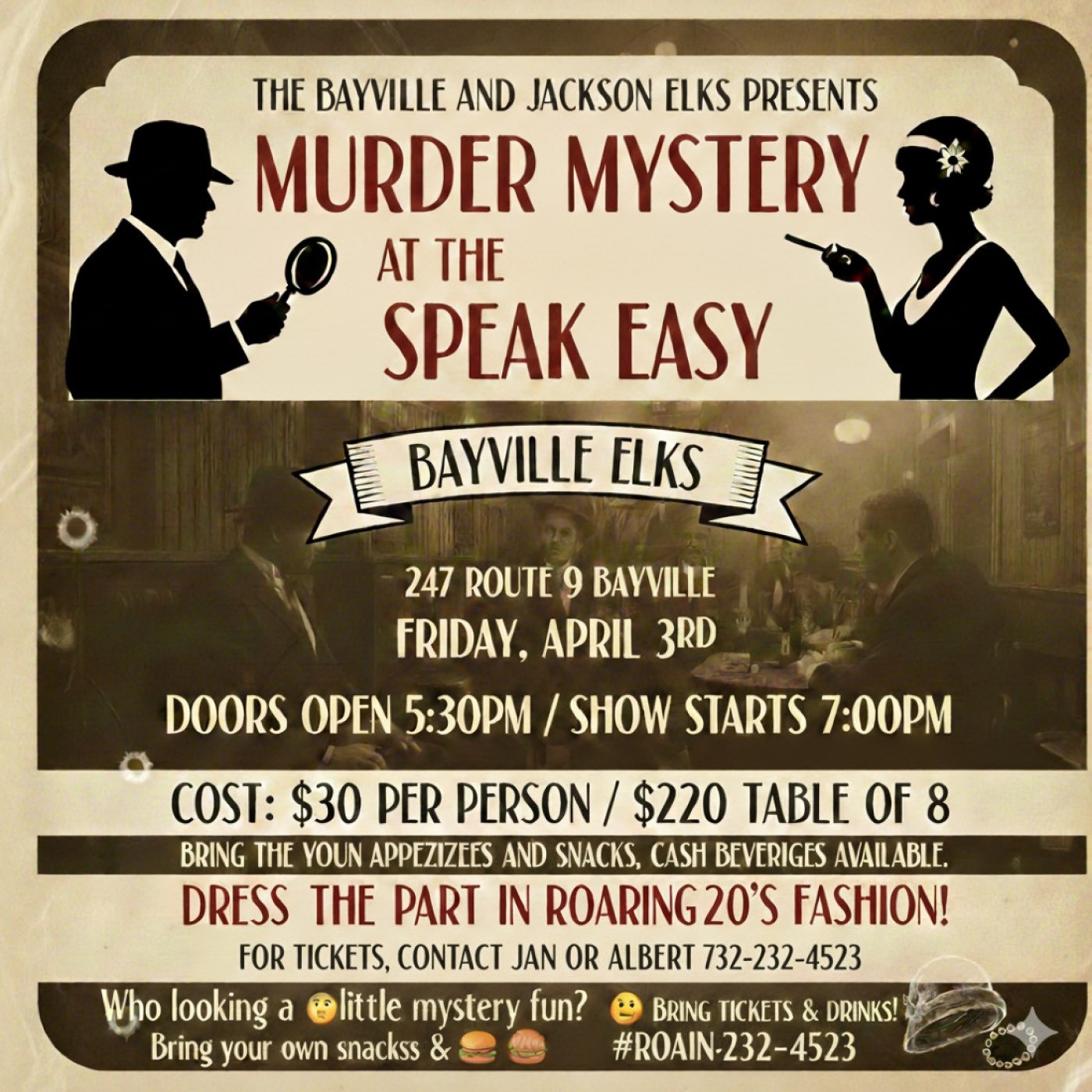 #MurderMystery #SpeakeasyNight #BayvilleElks #JacksonElks #Roaring20s #CommunityEvent #BayvilleNJ