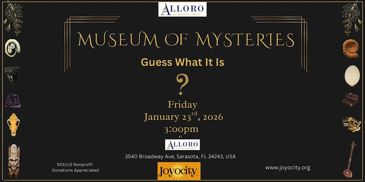 Join us on Friday, January 23, 2026 at 3:00 PM for an exciting adventure into the unknown. An hour filled with intrigue and curiousity. Come see the mysterious, strange, and unusual collection of our Museum of Mysteries. Then, stay for an engaging presentation where you'll be invited to guess what the item is or the purpose behind each mysterious piece. Some may look familiar where others may be harder to guess. Come have some fun and see some interesting things.