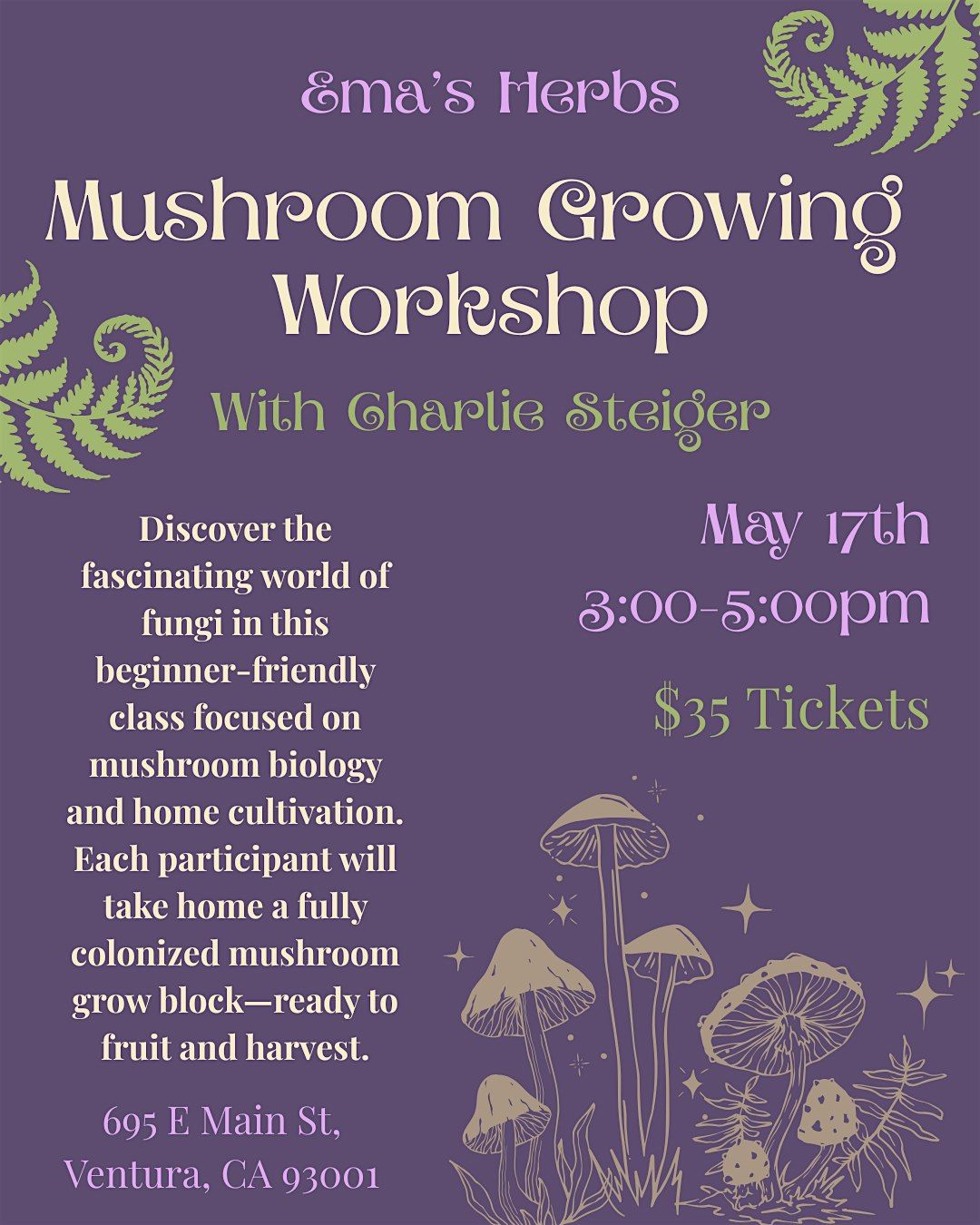 Discover the fascinating world of fungi in this beginner-friendly class focused on mushroom biology and home cultivation. You'll learn the basics of the fungal life cycle, why mushrooms are worth growing, and the essential tools, terms, and techniques to get started. We'll explore popular mushroom species, simple ways to grow at home, and touch on advanced methods for the curious. Each participant will take home a fully colonized mushroom grow block—ready to fruit and harvest. Perfect for hobbyists, gardeners, or anyone curious about mushrooms!