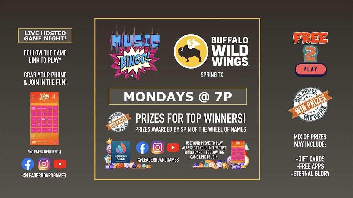 Buffalo Wild Wings - Spring TX hosts Music BINGO Game Night on Mondays at 7p - Join us for great music, food, fun and PRIZES!