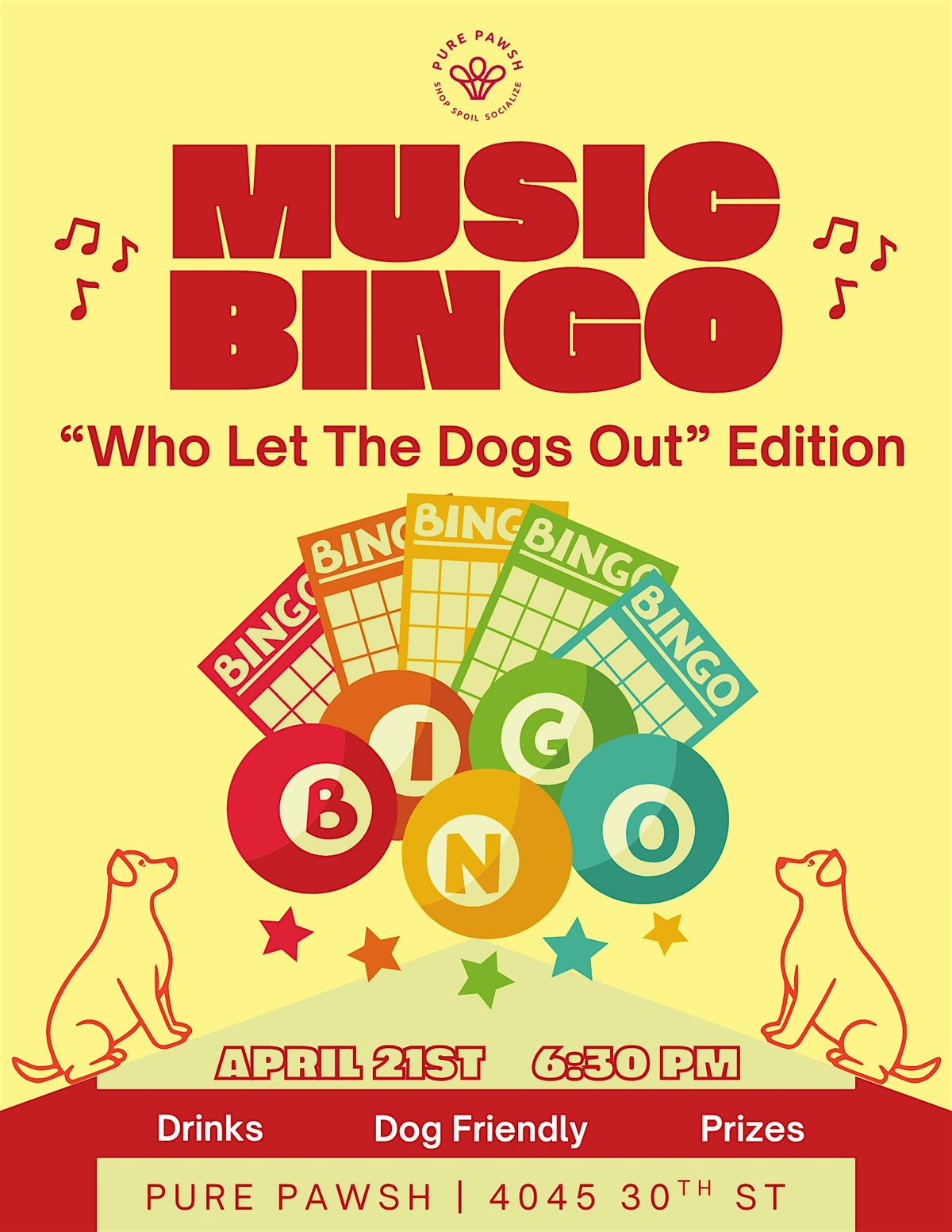Join us at Pure Pawsh for Music Bingo: Who Let the Dogs Out Edition on April 21st at 6:30PM! Think your playlist knowledge is top dog? ๐ถ๐ค