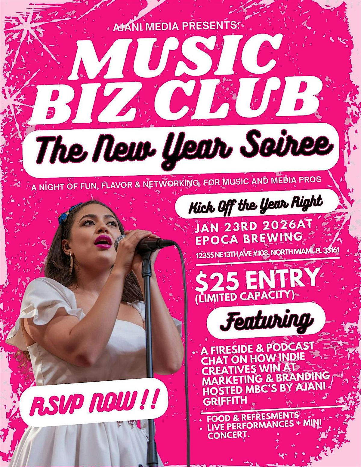 Music Biz Club: The New Year Soirée is an in-person gathering designed for indie artists, music professionals, and creative entrepreneurs who want to start the year with clarity, strategy, and real connections—not empty networking or surface-level conversations.