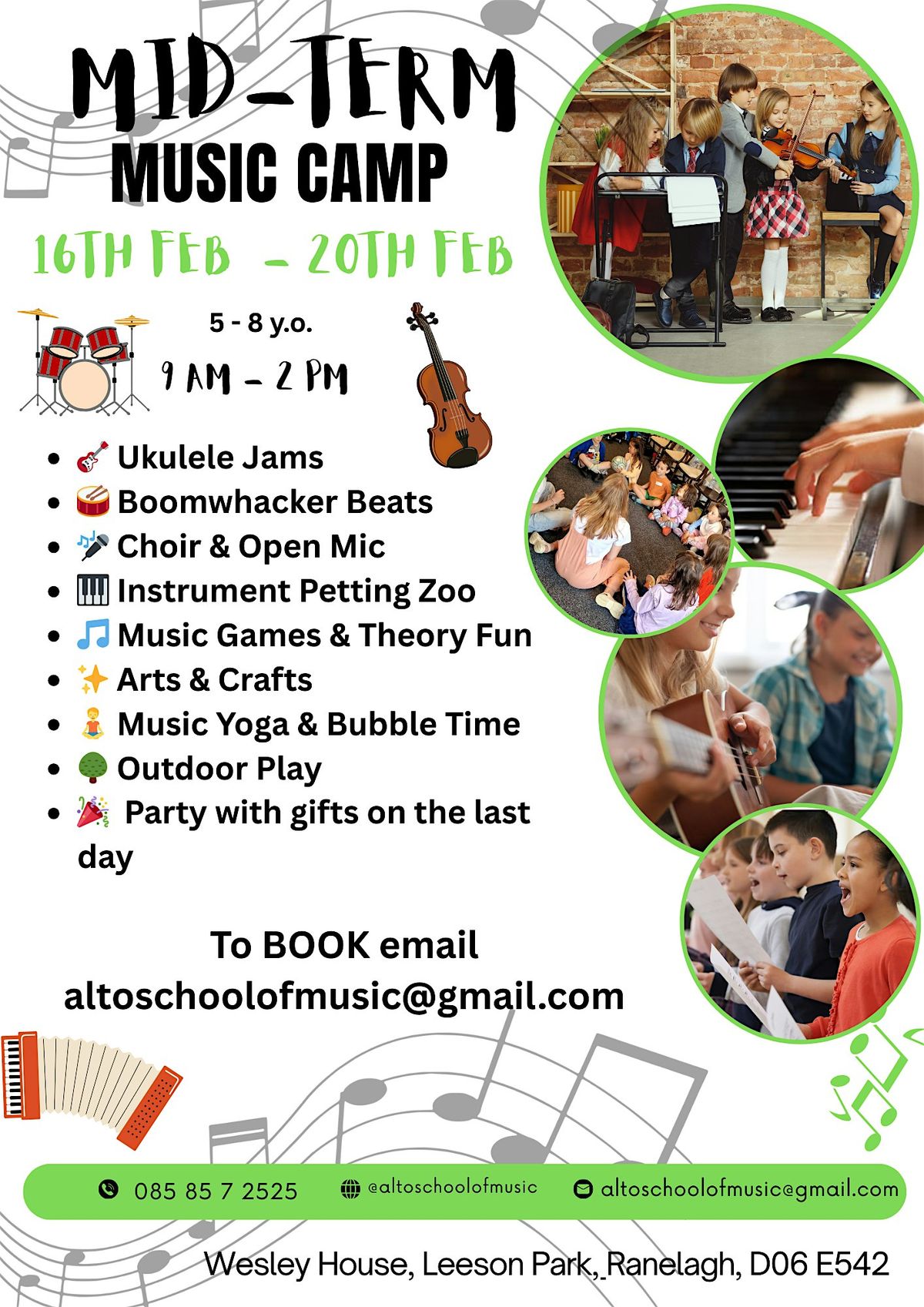 Our Mid-Term Music Camp is a fun, creative, and engaging week designed for children aged 5–8 years, running from Monday 16th to Friday 20th February, 10:00am–2:00pm, at Wesley House, Leeson Park, Ranelagh.