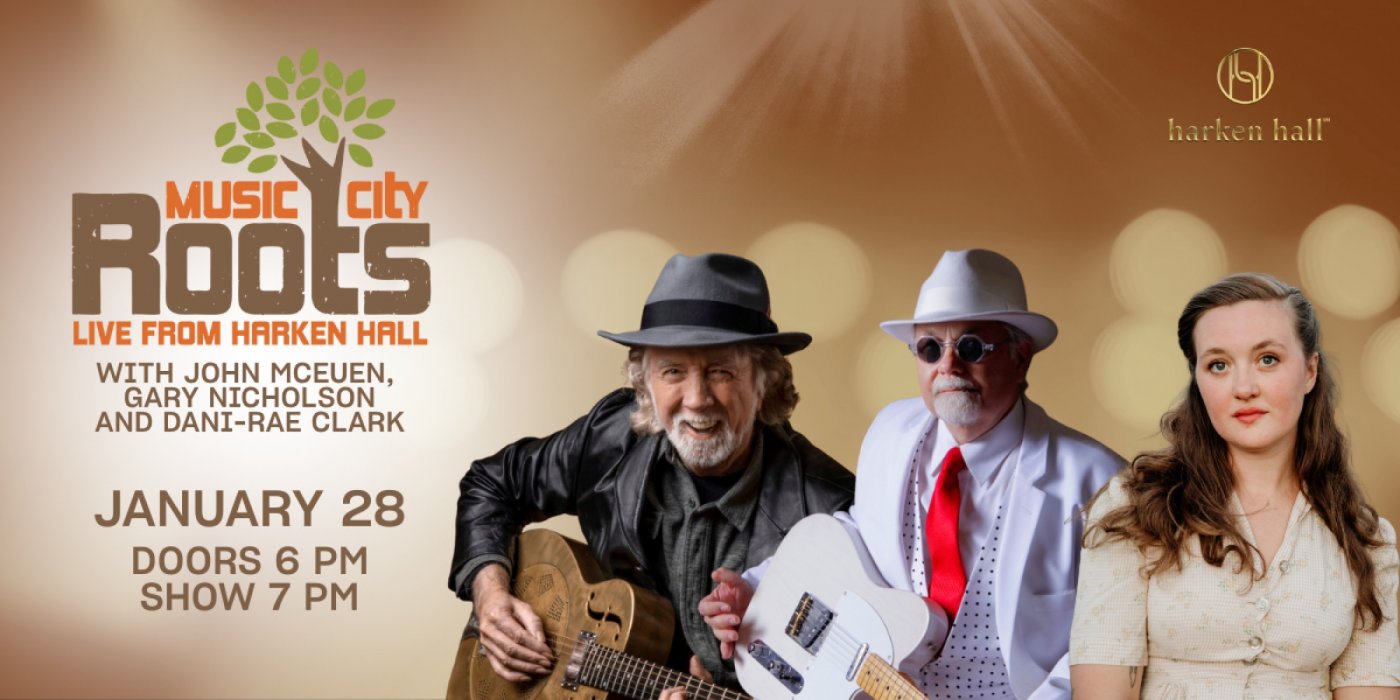 Join us for a special evening of Music City Roots at Harken Hall, featuring performances by John McEuen, Gary Nicholson, and Dani-Rae Clark, celebrating the depth, soul, and continued evolution of American roots music.