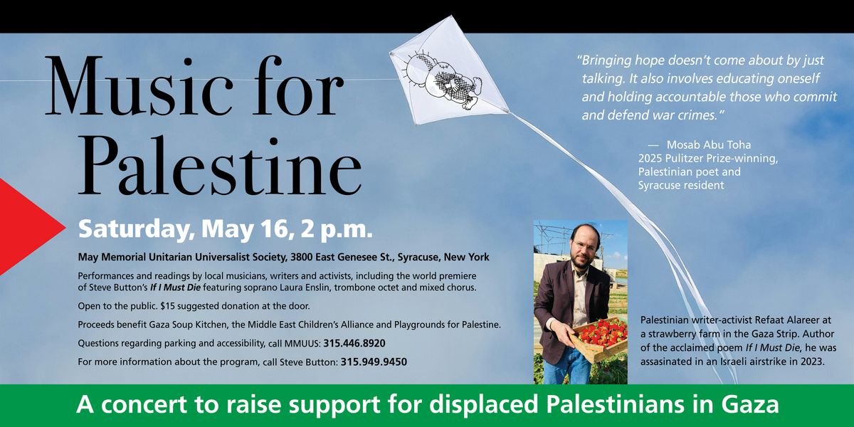Musicians, activists and community members from Central New York are coming together for a special fundraiser titled “Music for Palestine.” The concert takes place on Saturday, May 16, at 2 p.m. at May Memorial Unitarian Universalist Society (MMUUS) in Syracuse.