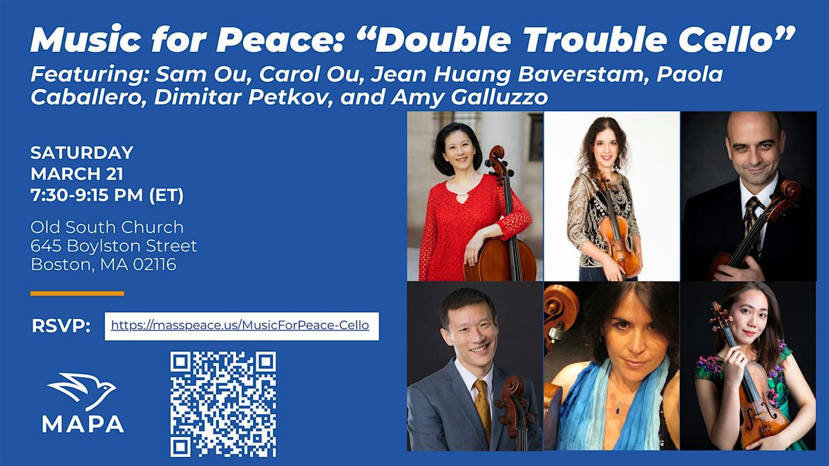 Join Mass Peace Action on March 21st for a classical music experience! We are delighted to present Double Trouble Cello featuring Sam Ou, Carol Ou, Jean Huang Baverstam, Paola Caballero, Dimitar Petkov, and Amy Galluzzo.