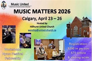 This year’s Music Matters will be held at Hillhurst United Church in Calgary, Alberta where Music Director Amanda Massey will be our host and via ZOOM on April 23-26 2026. For anyone available to arrive early, there will be a road trip to Banff on Thursday morning leaving at 9:00 am. Some of our workshop highlights will include how to play from a lead sheet, create and rehearse with a worship band, vocal techniques, sacred drumming, incorporating indigenous components into worship, inclusive language, and lots and lots of music.