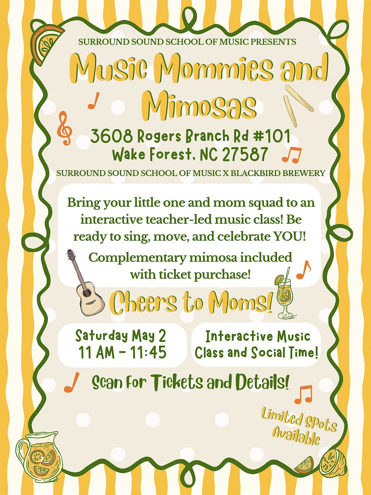 Join us for Music Mommies & Mimosas, hosted in collaboration with Blackbird Brewery! This 45-minute guided music experience is for children ages 5 & under. Little ones will explore sound and movement through songs, instruments, and playful activities; all in a supportive, engaging setting designed to spark creativity and connection.