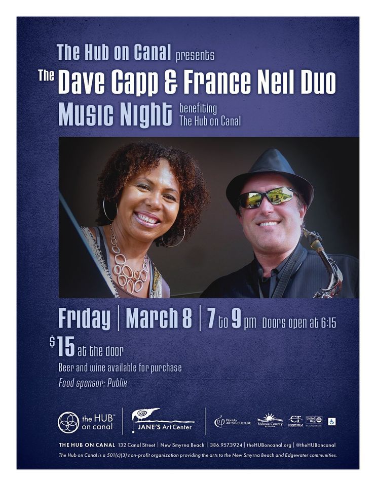 Date: Friday, March 8, 7-9pmGet ready for a night of genre-spanning music from the last few decades. You'll hear classics from artists as diverse as Fleetwood Mac, Stevie Wonder, Etta James, and Ed Sheeran. Dave paces the performance with his saxophone and France Neil, who has sung backup for Tina Turner and not performed often in the New Smyrna Beach area, will captivate you with her vocals.