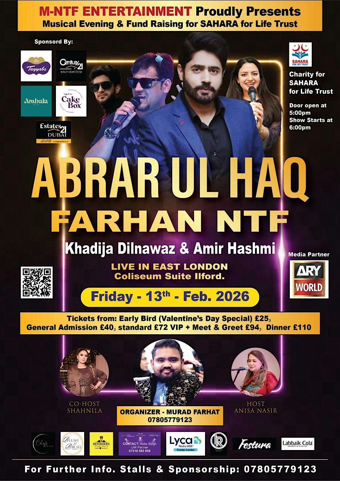 Join the king of Bhangra Abrar ul haq perform a live charity concert alongside Farhan NTF, Amir Hashmi and Khadijah Dilnawaz. Book now!
