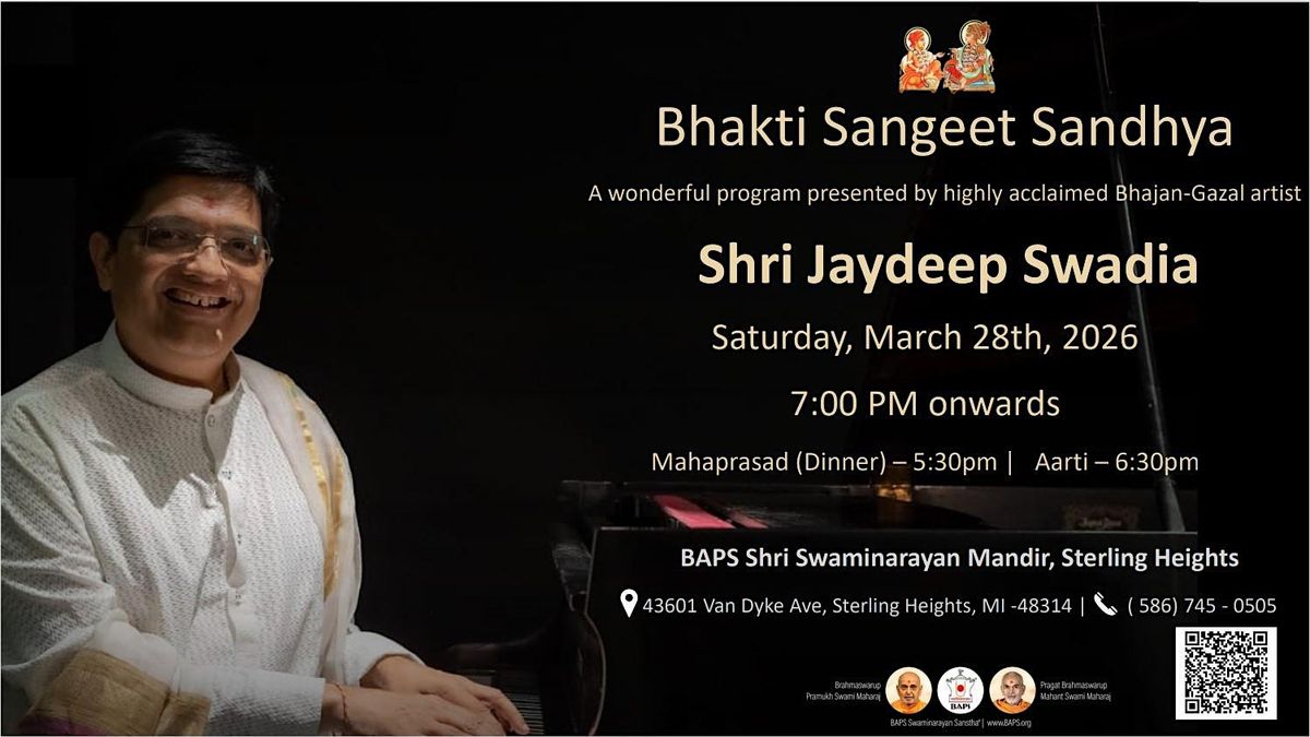 Join us in person for an unforgettable evening with Shri Jaydeep Swadia. Experience soulful melodies and vibrant tunes that will lift your spirits and bring the community together. It's the perfect chance to enjoy great music and have a blast with friends and family. Don’t miss out on this live musical extravaganza!