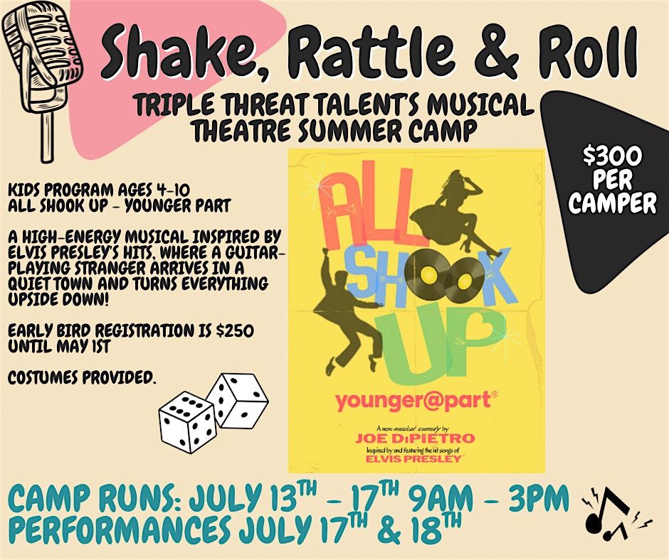 Get ready to sing, dance, and rock the stage! In this exciting week-long musical theatre camp, students will rehearse and perform the full All Shook Up: Younger@Part musical, officially licensed through Theatrical Rights Worldwide.