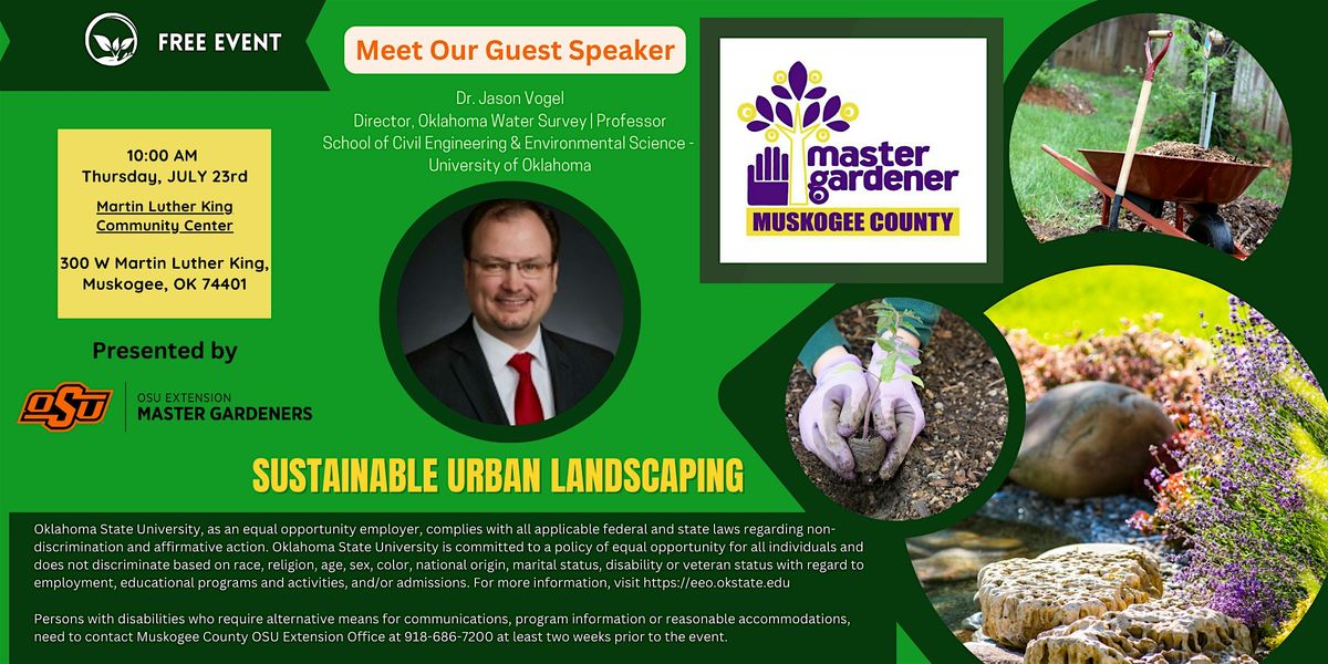 University of Oklahoma. Dr. Vogel will be speaking on the topic of, "Sustainable Urban Landscaping" This event is FREE for the public to attend on Thursday, JULY 23, 2026 @ 10AM located at the MLK Community Center.