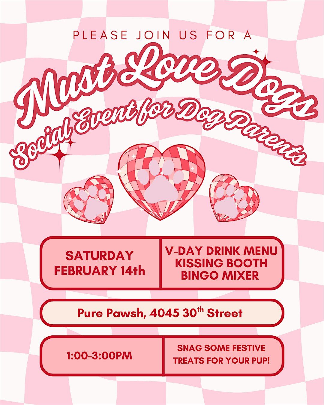 Join us for a Must Love Dogs Social Event at Pure Pawsh on February 14th from 1:00-3:00 p.m.