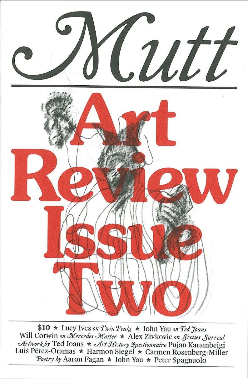 Mutt Art Review is a quarterly, print-only magazine featuring art criticism, essays, reviews, fiction, and artists’ writing. It covers art shown or made in NYC, is distributed locally and is available for delivery nationwide. Contributors to its first three issues (#0, #1 and #2) include: Barry Schwabsky, Kayode Ojo, Lucy Ives, Will Heinrich, John Yau, Darla Migan, Nikki Shaner-Bradford, Bob Nickas, Sunday Fall, Tif Sigfrids, Luis Pérez-Oramas, Martha Schwendener, and the late Walter Robinson.