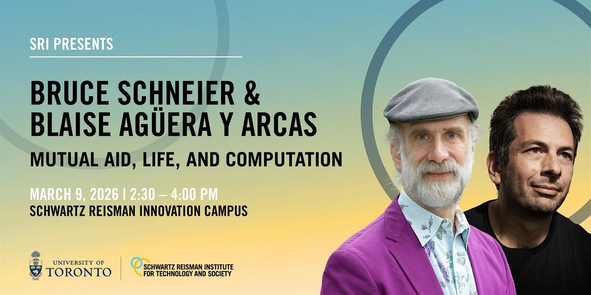 On March 9, 2026, the Schwartz Reisman Institute for Technology and Society will host an in-person dialogue between renowned security technologist and SRI Visiting Senior Policy Fellow, Bruce Schneier and computational scientist, VP and Fellow at Google, Blaise Agüera y Arcas. Together, they will explore Mutual Aid, Life, and Computation — a provocative rethinking of how cooperation, rather than competition, underpins biological evolution, economic systems, and artificial intelligence.