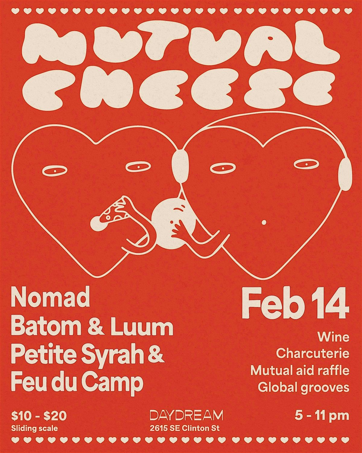 Cheesy, love inspired global grooves, charcuterie for grazing, a raffle for mutual aid, wine poured by the Daydream, and more!
