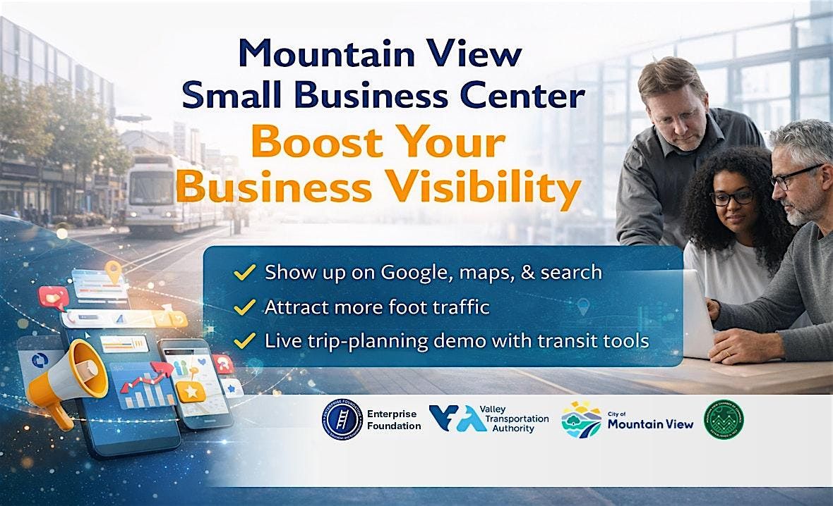 Learn simple tools to help customers find your business. In this free workshop from the Mountain View Neighborhood Small Business Center, you’ll discover how to improve your presence on Google, maps, and search, attract more foot traffic, and make your business easier to find in Mountain View. The session also includes a live trip-planning demo showing how customers and employees can easily reach your business using local transit tools. Open to entrepreneurs, home-based businesses, and storefront owners.