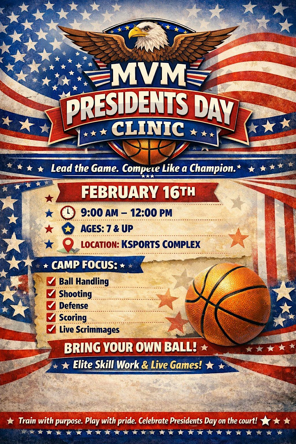 Join us for the MVM PRESIDENTS DAY CLINIC, an awesome in-person event! It's the perfect chance to sharpen your skills, meet cool people, and have a blast. Whether you're a beginner or a pro, there's something here for everyone. Don't miss out on this fun and interactive day designed to boost your game and confidence. Come ready to learn, play, and enjoy the day with us!