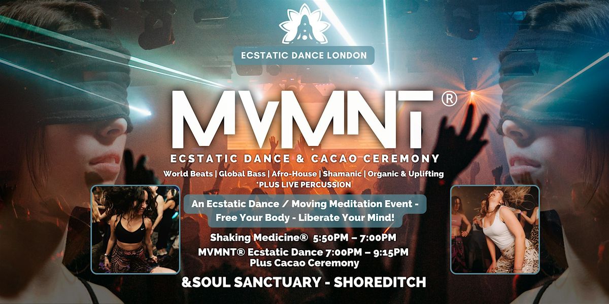 7:00pm - 9:15pm MVMNT® Ecstatic Dance & Cacao Ceremony. Music: Shamanic | Medicine | Global Bass | Afro House | Tribal + Live Percussion. We will provide complimentary Raw Vegan Cacao with natural sweetener - super yummy, the best in London for sure!