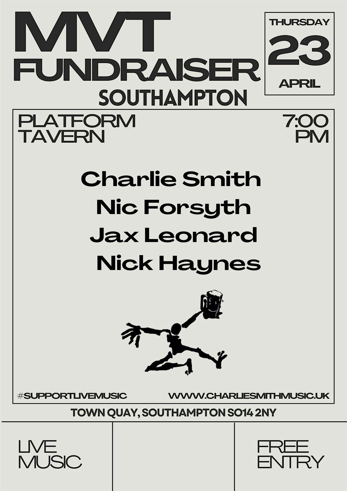Hi, I'm Charlie Smith, an Alternative Acoustic artist from Hampshire, UK. In April, I will be embarking on my spring tour fundraising for the Music Venue Trust. This will include six different grassroots music venues around England. Join us on Thursday, 23rd April, at the Platform Tavern to show your support for the independent music scene.