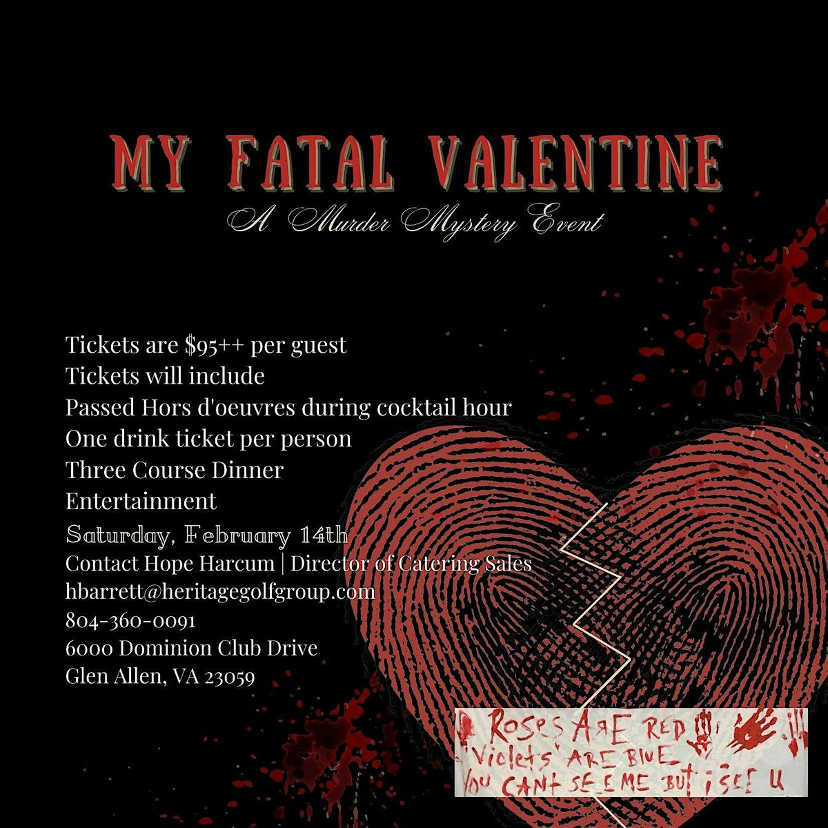 You are invited to My Fatal Valentine, an immersive M**der Mystery Dinner Event taking place on Saturday, February 14th at The Dominion Club.