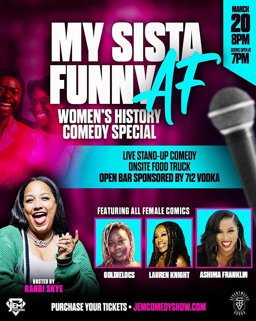 Welcome to My Sista Funny AF, a special comedy experience spotlighting funny, fearless women who know how to command a stage and keep the crowd crying laughing all night long. Hosted at The JEM at Pittsburgh, this special event brings together live stand-up comedy, great vibes, and an open bar sponsored by 712 Vodka for a night filled with toasts of celebration for our beautiful sistas!