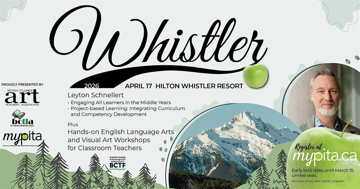 Join us at the 2026 Provincial Intermediate and Middle Years Teachers Association (myPITA) Spring Teachers Conference on April 17, 2026, in Whistler, presented in partnership with the British Columbia Art Teachers Association - BCATA and the BC Teacher-Librarians’ Association - BCTLA.