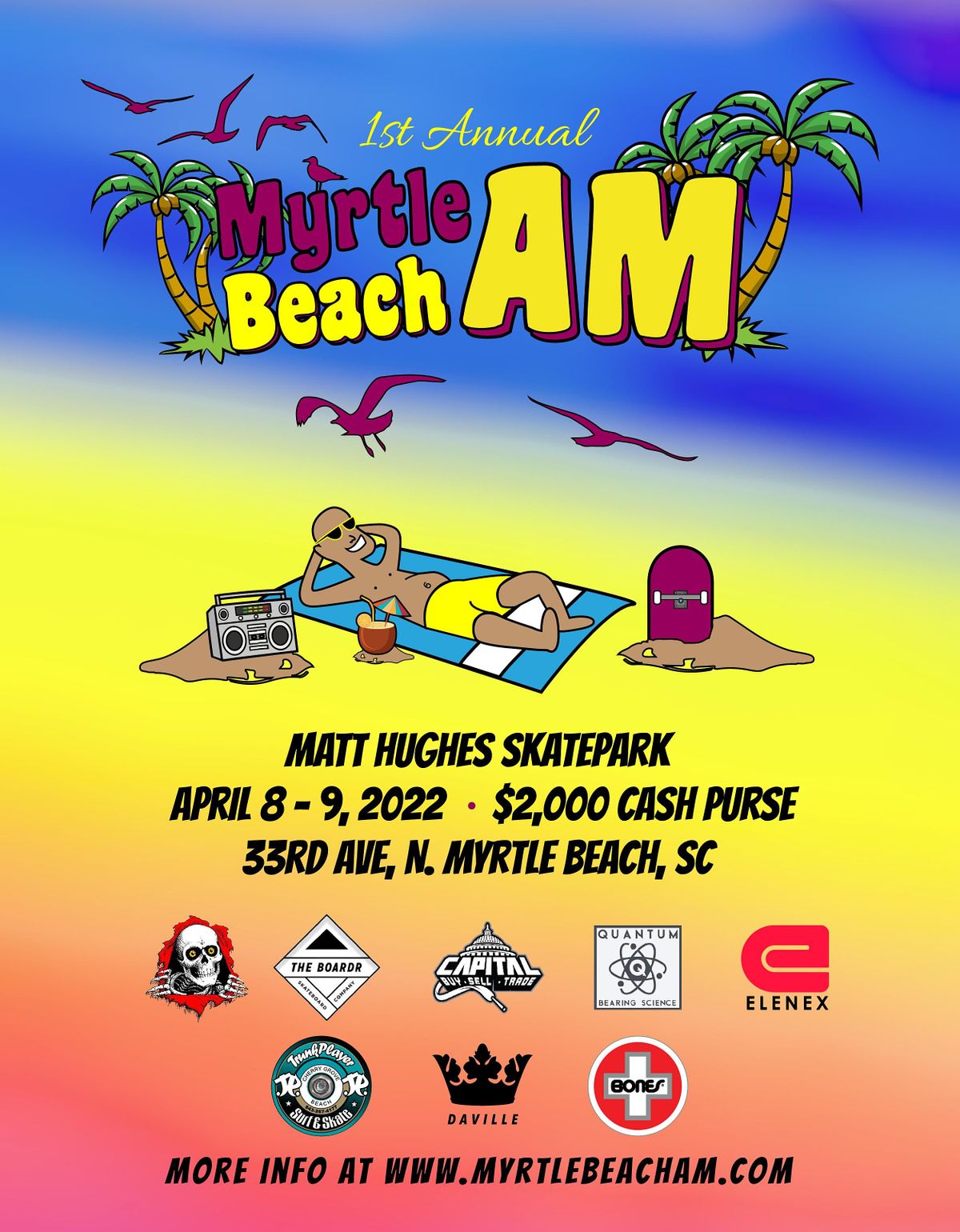 The Friends of the Skateparks Foundation has partnered with Boardr, Daville Skate Shop, Thrasher Magazine, and the City of Myrtle Beach, SC to bring to the region the 1st annual Myrtle Beach Am skateboarding contest / festival. We are inviting the top sponsored amateur skateboarders from around the world to come compete for a $2000.00 cash purse, trophies, bragging rights, and prizes. These skaters will be tomorrow’s pros who will put it all on the line to move up in the ranks. The Myrtle Beach Am will deliver some amazing skateboarding and a good time in a festival type atmosphere of live music, food trucks, 30+ vendors, raffles, silent auctions, games, and after parties. We are expecting 80-120 top competitors, 3000+ spectators.