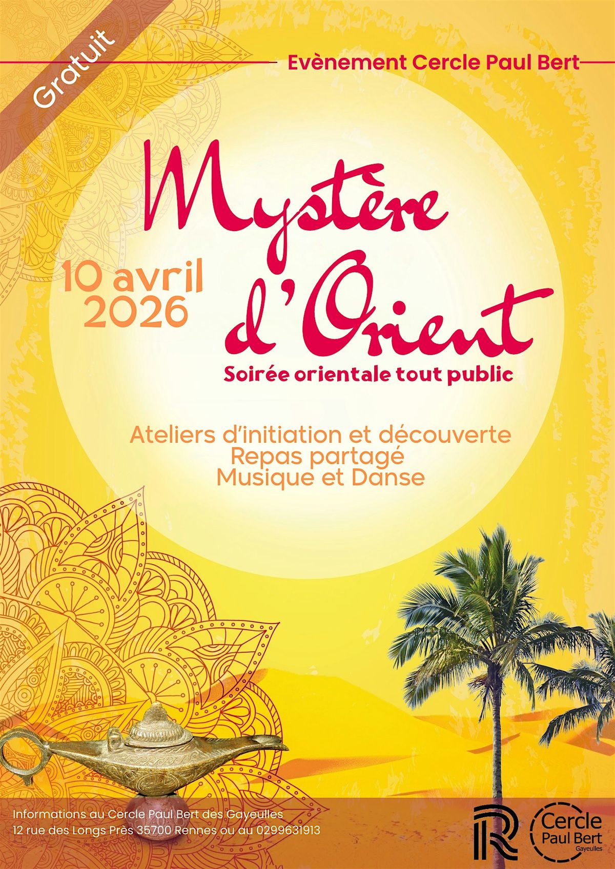 Dans le cadre de la soirée "Mystère d'Orient" où vous y retrouverez des ateliers artistiques, un concert, un spectacle. Rejoignez-nous aussi sur un repas partagé.