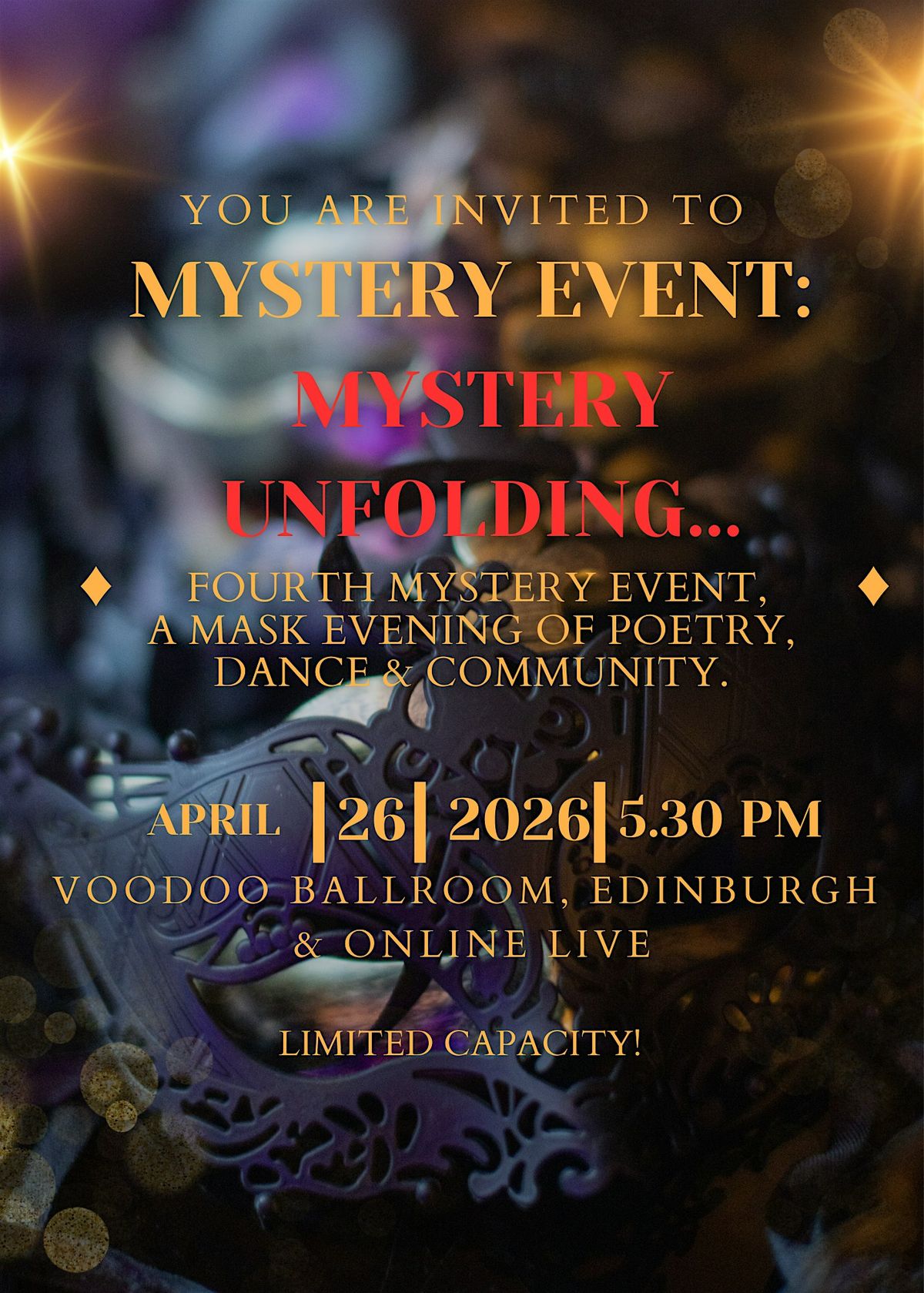 Mystery Event is our community gathering—part performance, part connection, part celebration. You’ll experience dance + poetry moments, gentle participation (if you want!), and a night that moves from “watching” into “being in it”… without revealing everything. 😉