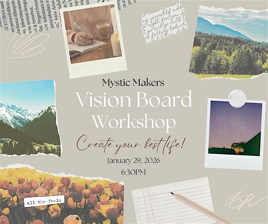 Welcome to the Mystic Makers Vision Board Workshop for a night of creativity and manifestation. Get ready to bring your dreams to life through the power of vision boards. Let's set intentions, get crafty, and visualize our futures together. No experience necessary, just bring an open mind and your favorite magazines. See you there!