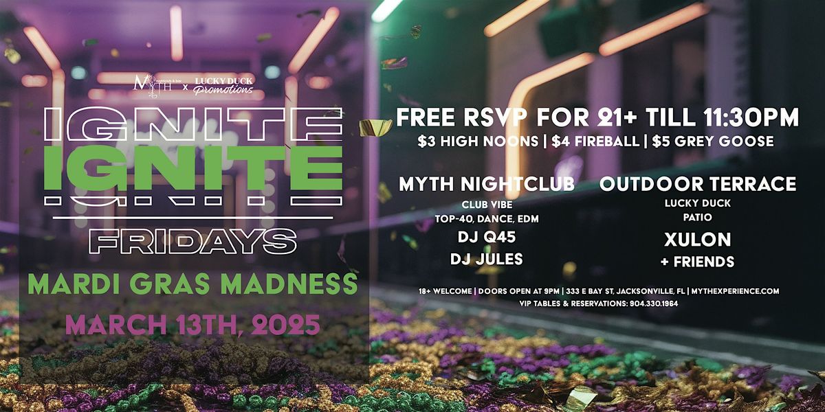 Step into the wild side of Ignite Fridays as Myth transforms into a full-scale Mardi Gras celebration β beads flying, drinks flowing, and nonstop energy from the dance floor to the patio.