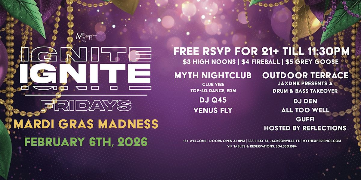 Jacksonville’s wildest Mardi Gras–themed Friday night! We’re turning Myth Nightclub into a full-blown carnival experience — beads, colors, energy, and nonstop vibes all night long.