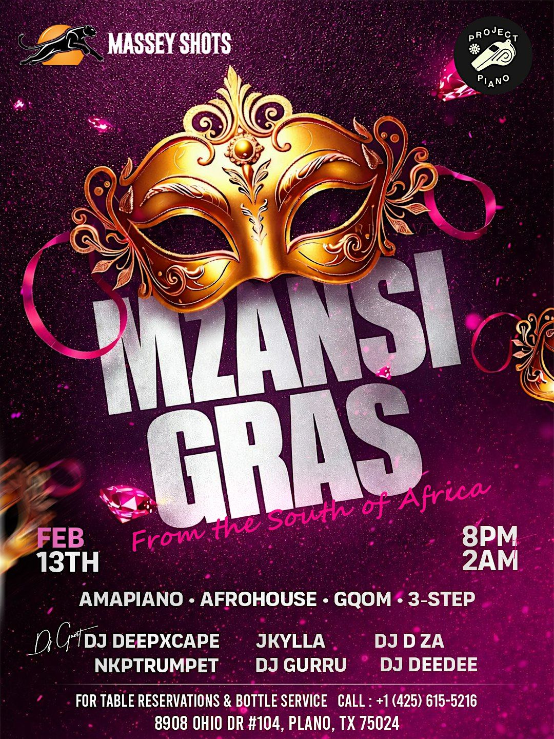 Massey Shots brings you Mzansi Gras, a South African–inspired Mardi Gras night with Amapiano, Afrohouse, Gqom, and 3‑Step from 8 PM to 2 AM. DJs Deepxcape, NKPTrumpet, Jkylla, DJ Gurru, DJ D ZA, and DJ Deedee keep the dance floor moving all night.