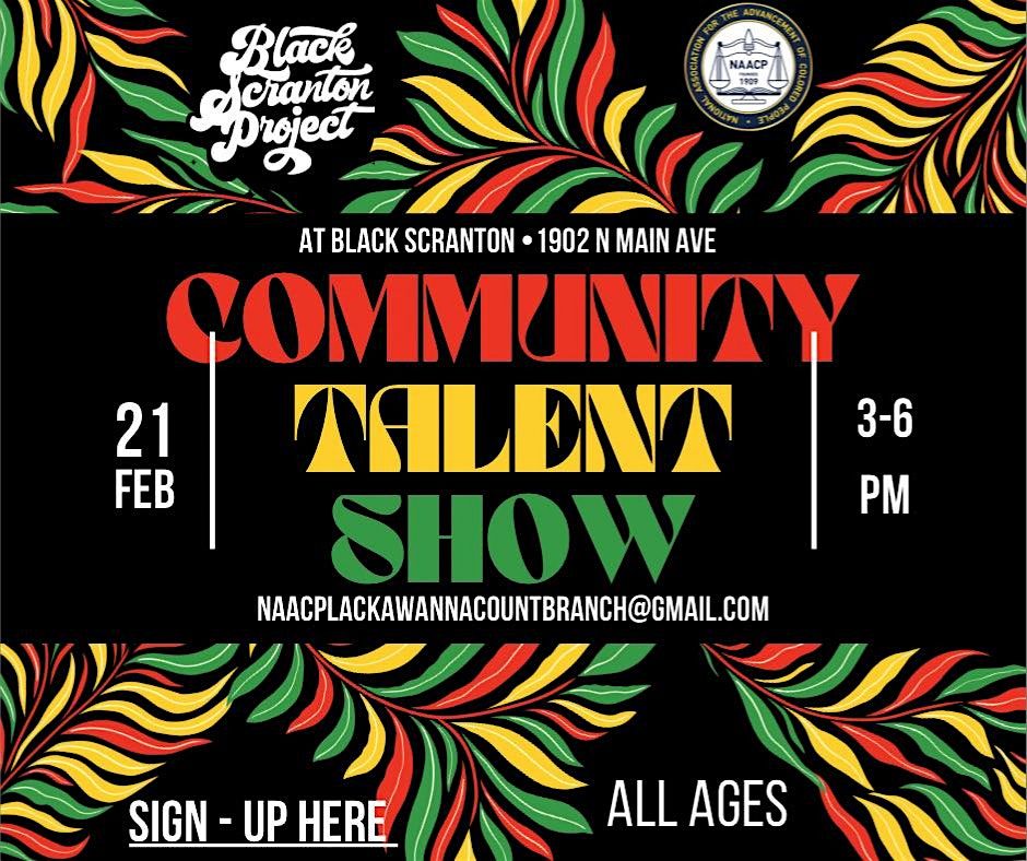 The Black Scranton Project, in partnership with the NAACP Lackawanna County Branch, invites you to an all-ages Community Talent Show celebrating local talent, self-expression, and Black creativity during Black History Month.