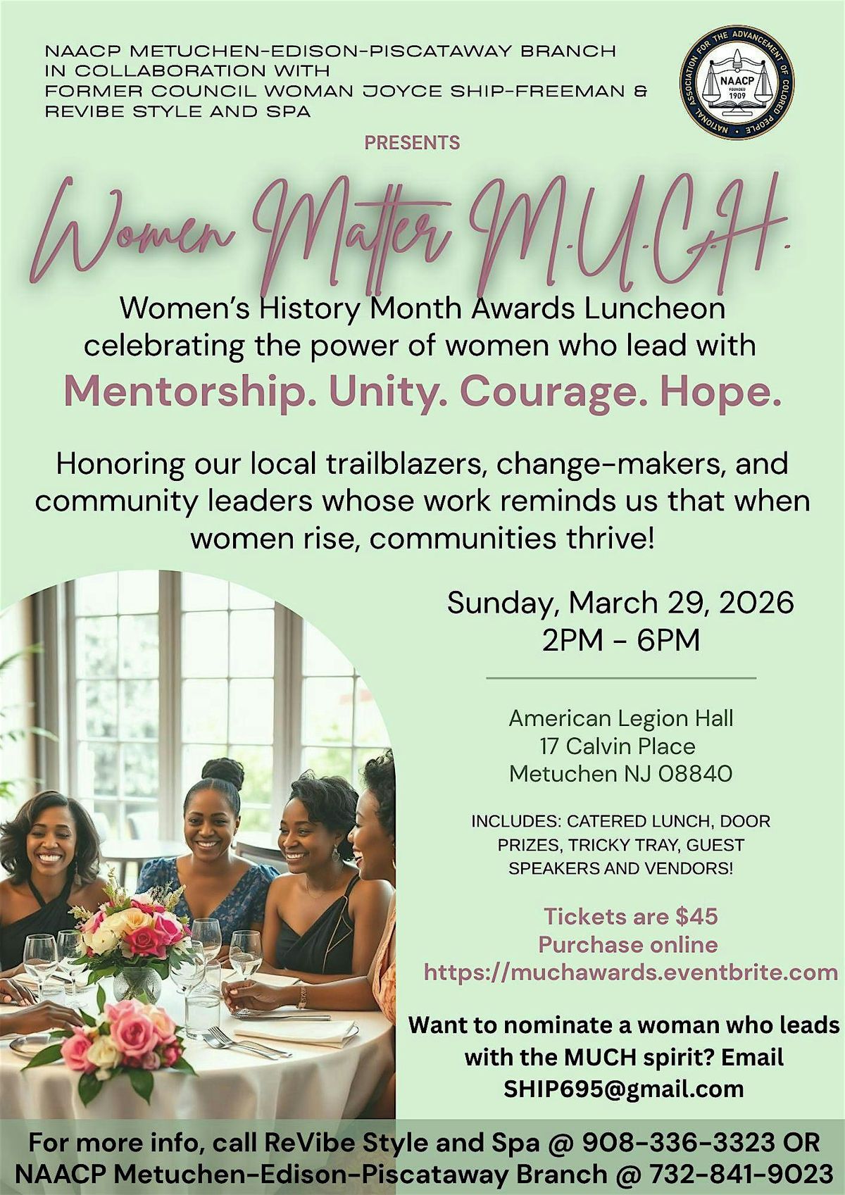 Join the NAACP MEAB Branch, former Councilwoman Joyce Ship-Freeman, and ReVibe Spa for an inspiring afternoon as we celebrate Women’s History Month at the Women Matter M.U.C.H. Awards Luncheon - a special event honoring everyday women - the women who show up, step in, and get things done for their families, neighborhoods, and communities, often without titles, headlines, or recognition.