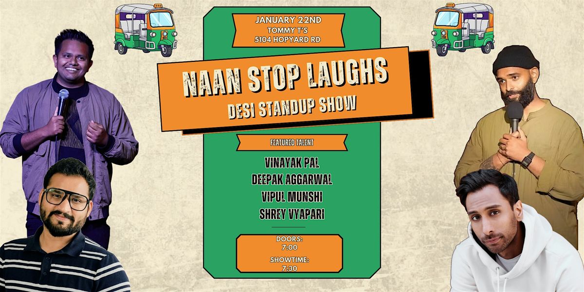 Get ready for a night of unstoppable laughter at Naan Stop Laughs, a Desi standup comedy showcase serving fresh jokes hotter than garlic naan! Join us at Tommy Tโs Comedy Club for an evening packed with sharp observations, cultural chaos, and stories every Desi can relate to (and roast).