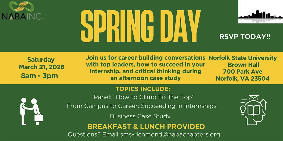 Come join NABA Inc. Richmond for Spring Day on Saturday, March 21 at 8:30am-3pm for a panel on "How To Climb To The Top" with senior level employees to Vice Presidents, a session "From Campus to Career: Succeeding ininternships", and a business case study to test your problem solving skills.