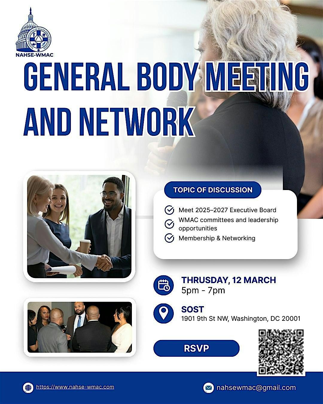 Join the Washington Metropolitan Area Chapter of NAHSE for our first General Body Meeting of the year on March 12th from 5:00 PM – 7:00 PM at Sost DC.