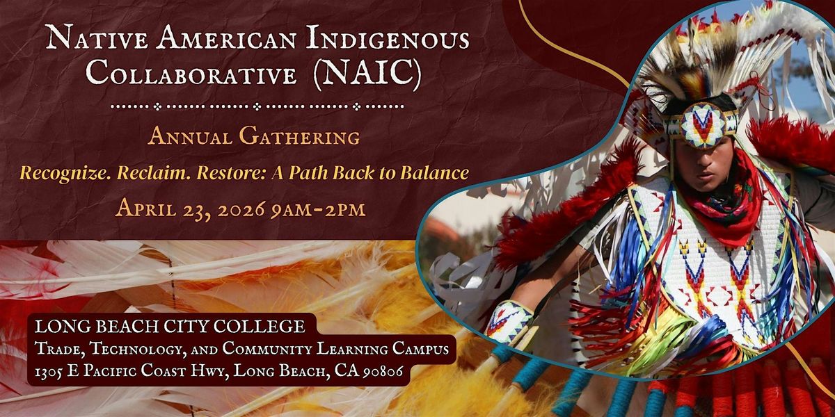 Join us at Long Beach City College - Trades, Technology, and Community Learning Campus on April 23, 2026 at 9:00 AM for a day of community and collaboration with the Native American Indigenous Collaborative (NAIC) at Long Beach City College. It’s a great chance to embrace, (re)connect, share ideas and celebrate culture. Don’t miss out on the NAIC 2026 Conference!