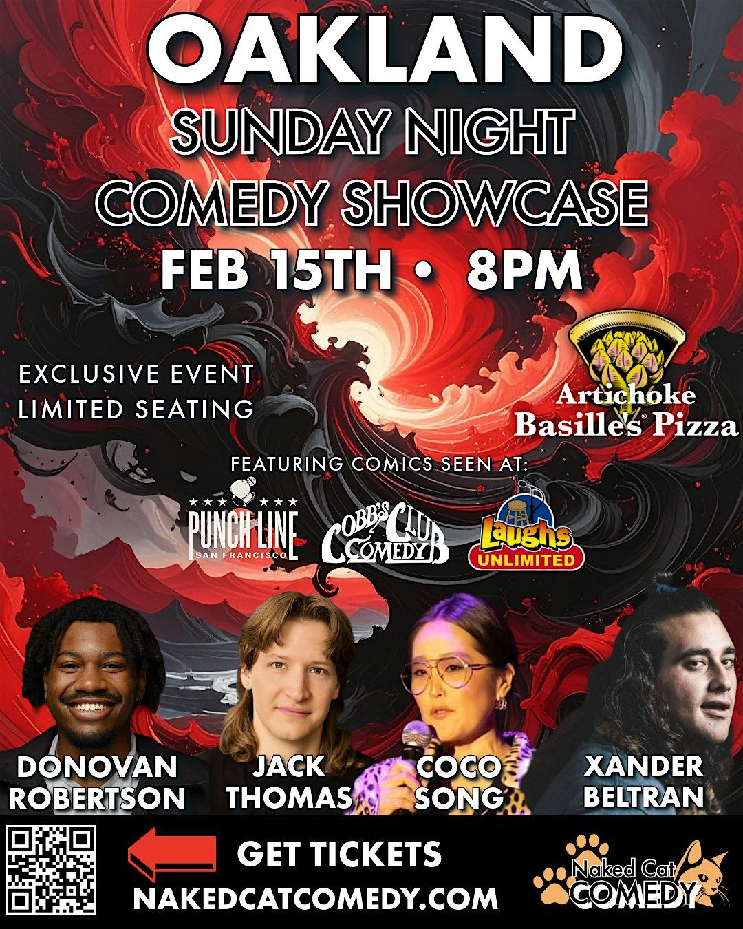 Naked Cat Comedy presents an Oakland Sunday Night Comedy Showcase — a high-energy stand-up show featuring a curated lineup of touring comics and top Bay Area talent, seen at Punch Line SF, Cobb’s Comedy Club, and Laughs Unlimited.