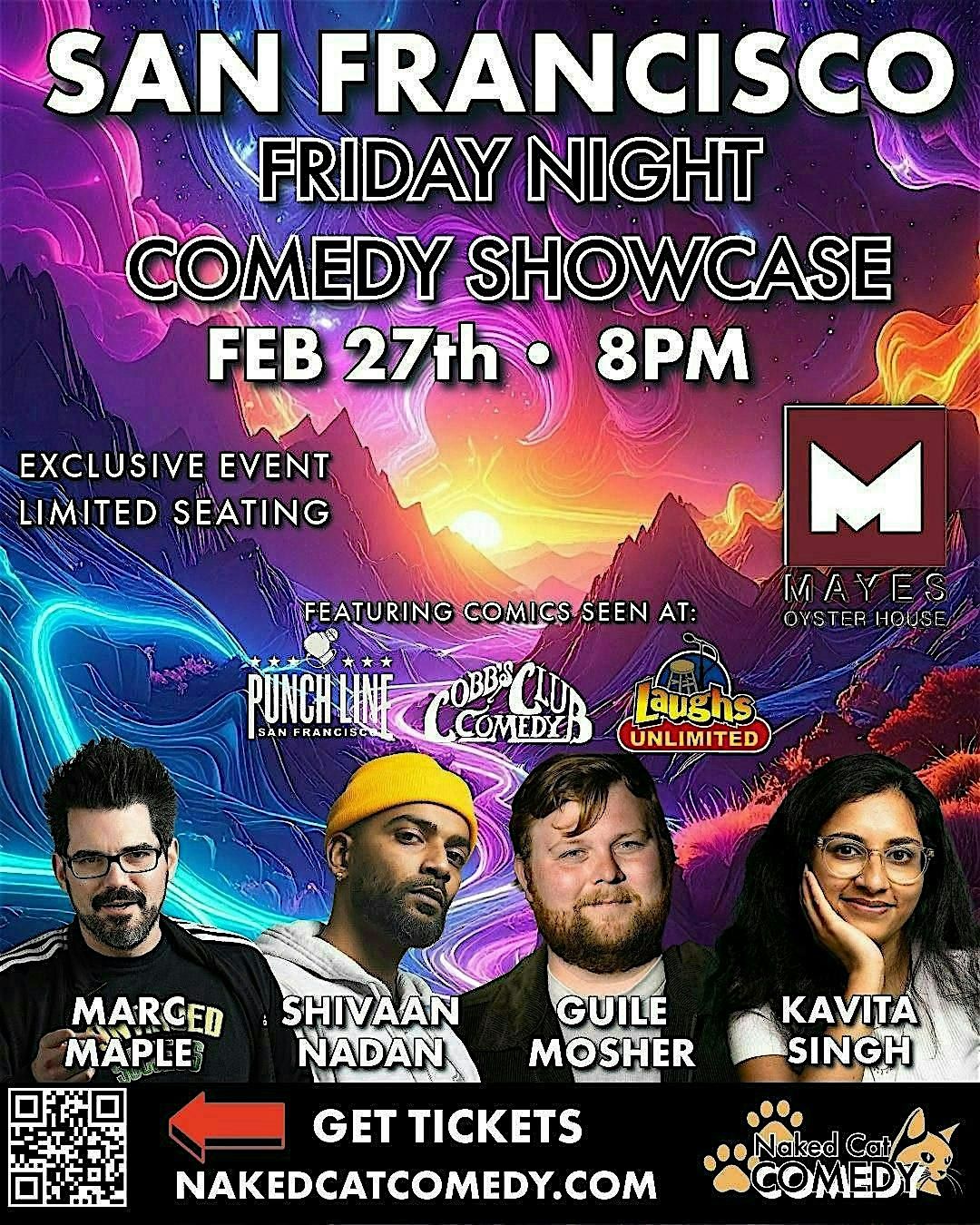 Naked Cat Comedy presents a San Francisco Friday Night Comedy Showcase — a high-energy stand-up show featuring a curated lineup of touring comics and top Bay Area talent, seen at Punch Line SF, Cobb’s Comedy Club, and Laughs Unlimited.
