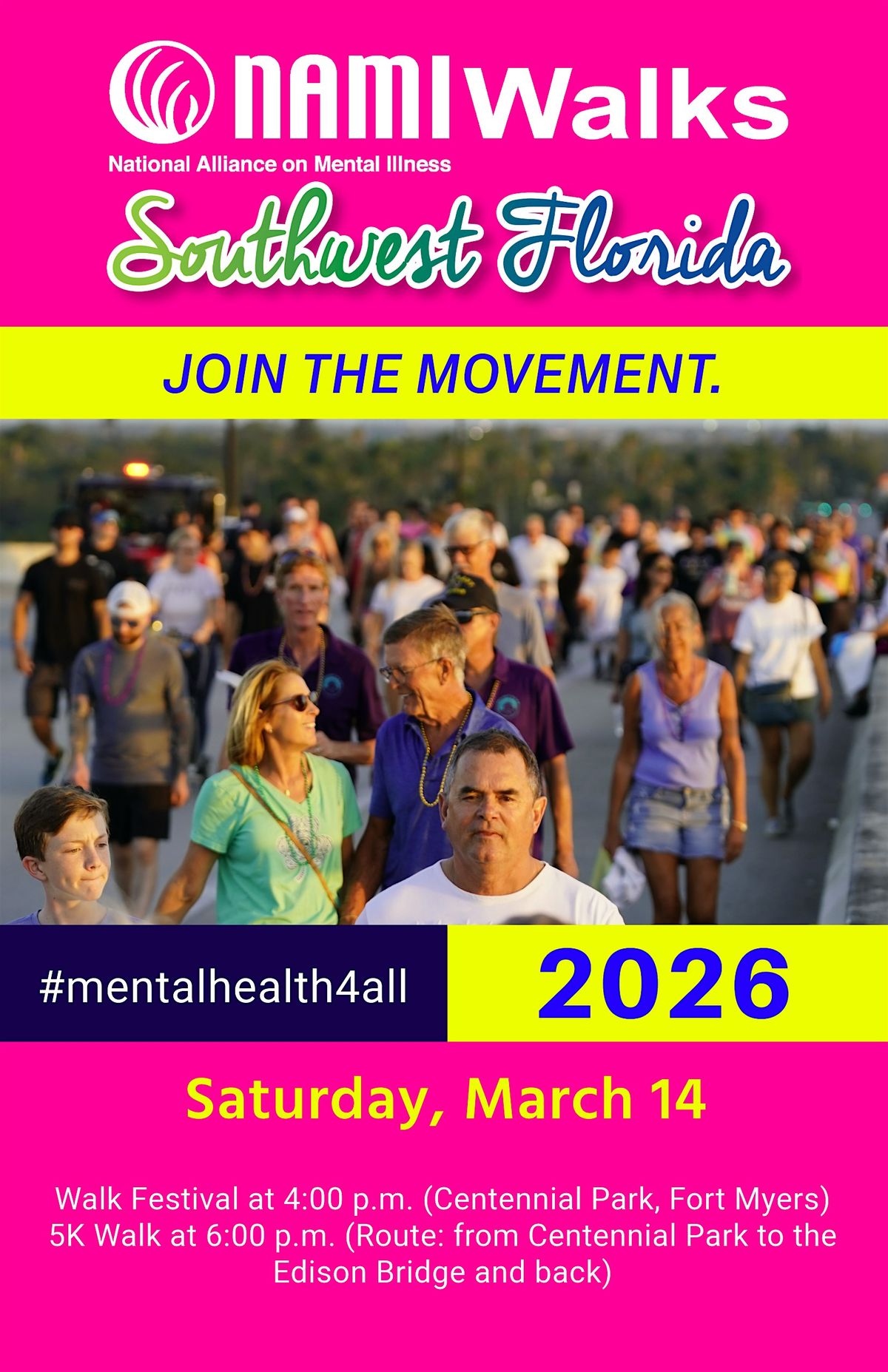 Join us for NAMIWalks Southwest Florida, a high-energy sunset 5K walk and waterfront community festival bringing together friends, families, coworkers, and local partners in support of mental health.