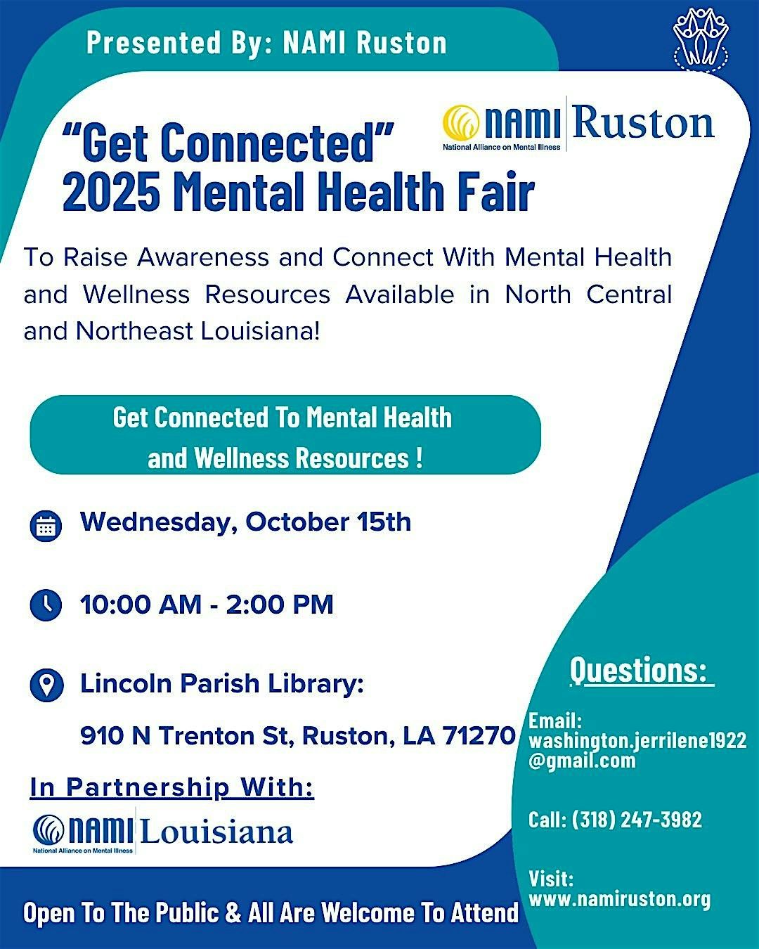 Get connected to the mental health and wellness resources in Northeast Louisiana through NAMI Ruston's "Get Connected!" Mental Health Resource Fair. In partnership with NAMI Louisiana, NAMI Ruston the fair will occur on Wednesday, October 15th at the Lincoln Parish Library in Ruston from 10:00 AM - 2:00 PM.