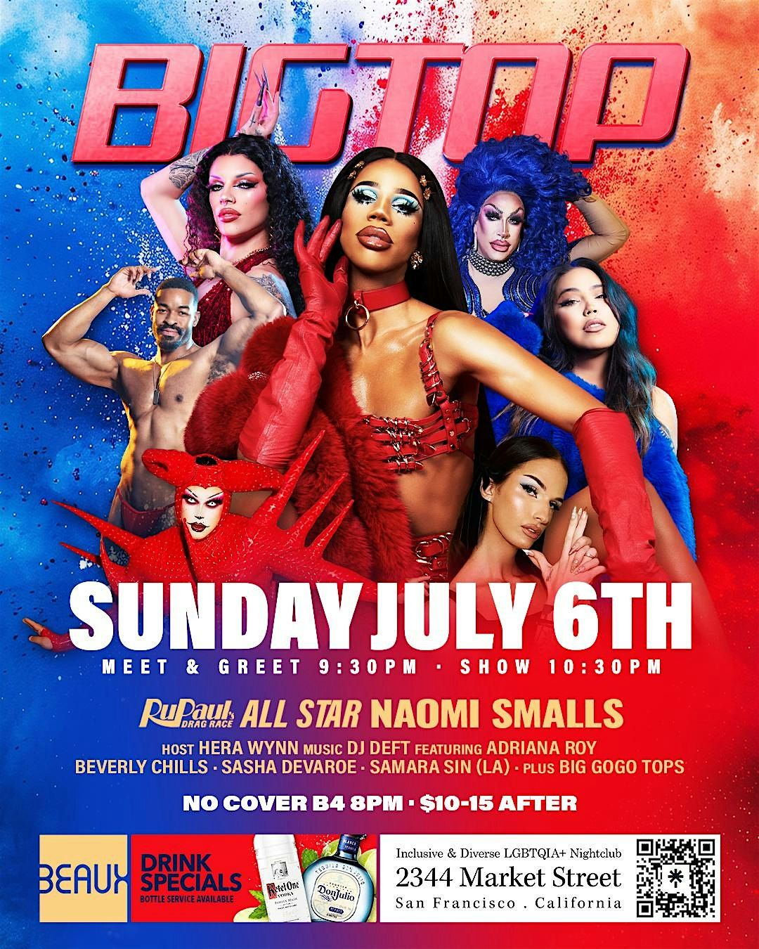 Join us for the Castro's longest running Sunday night drag show... Big Top Sundays. We've got the icon, Naomi Smalls of RuPaul's Drag Race bringing the house down! Do not miss this speacial event in the heart of the historic Castro district. This party includes drinks, dancing, gogo studs, legendary Rupaul's Drag Race star Naomi Smalls and local SF legendary drag queens.