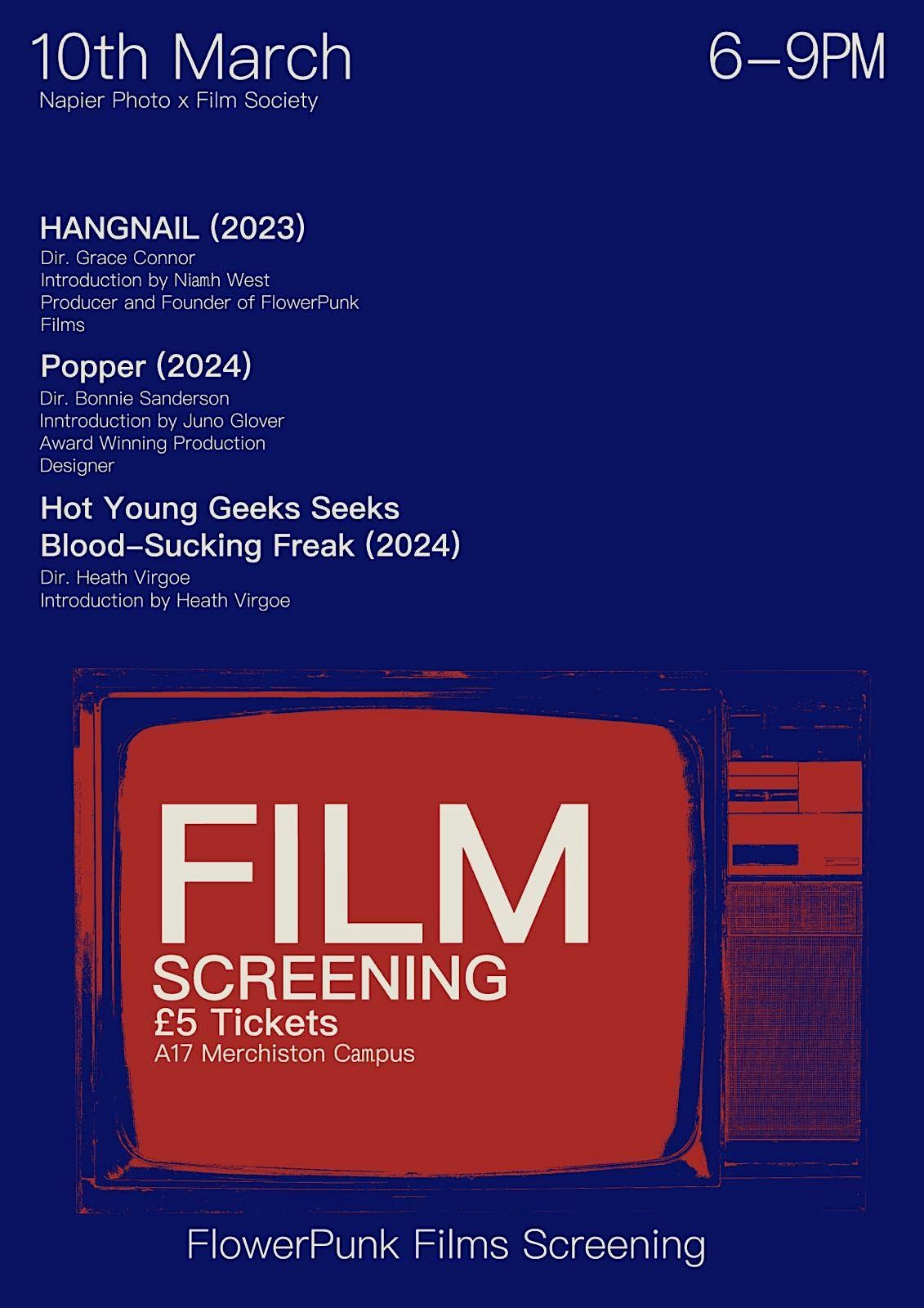 Come along to see three new short films with a Q&A 'Hangnail' (2023), 'Popper' (2024), 'Hot Young Geeks Seeks Blood - Sucking Freak' (2024)