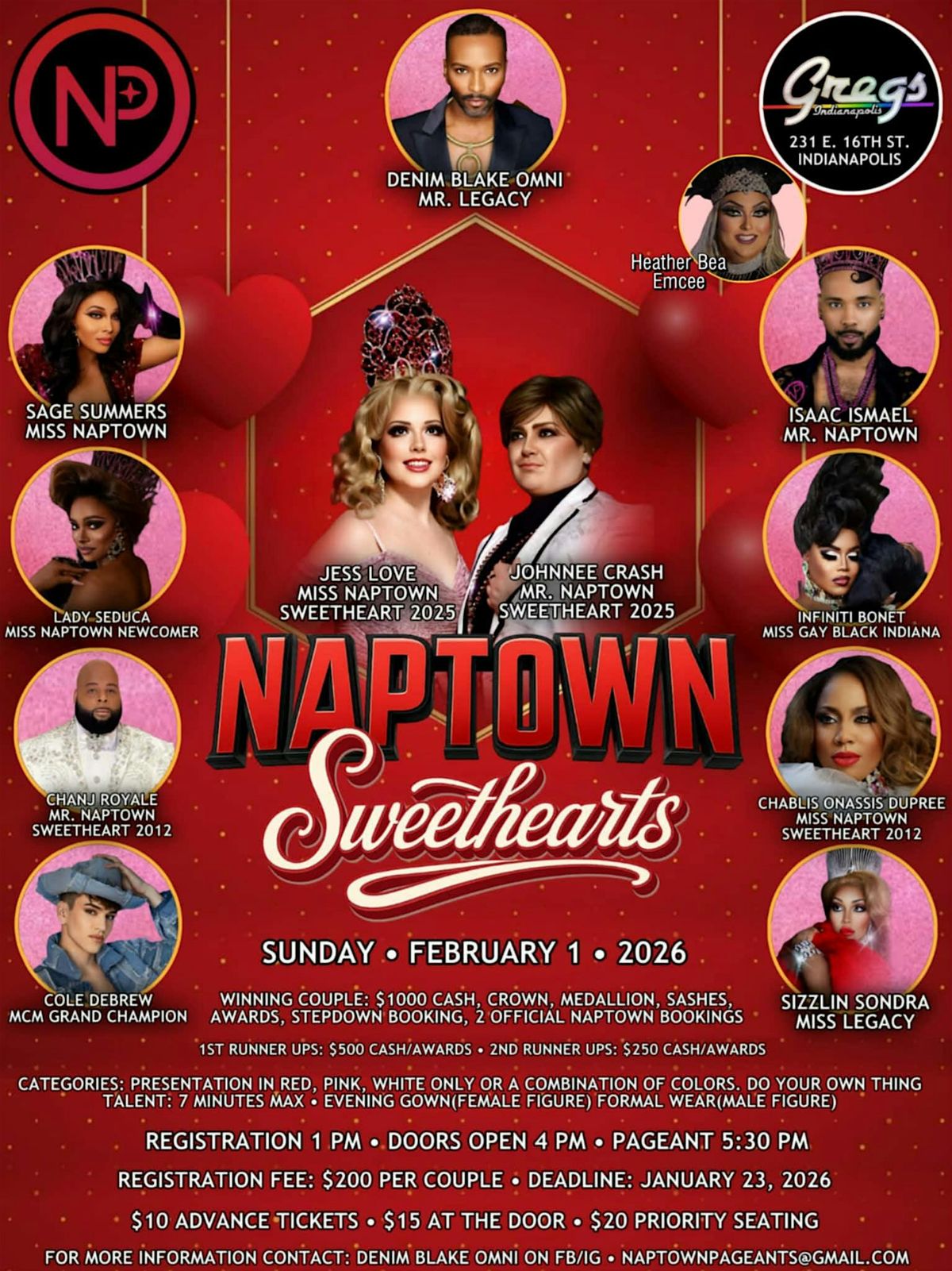 Welcome to the Naptown Sweethearts Pageant - The DUO Contest! Get ready for a night of dazzling performances and fierce competition at Greg's Indy. Join us as talented duos showcase their skills and creativity and vie for the coveted title of Naptown Sweethearts 2026. It's a night filled with glamour, talent, and unforgettable moments. Don't miss out on this exciting event that celebrates the power of partnership and talent. Grab your tickets now and come cheer on your favorite duos!