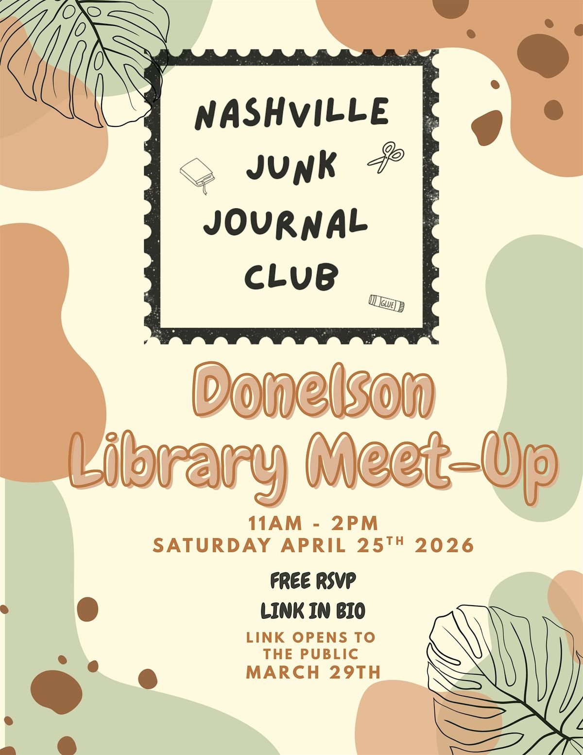 Hey, Nashville! I am so happy we are able to host this month's library event at the Donelson Library! This is a meet-up, not a workshop! If it is your first time, please let me know so I can help assist and do a quick walk through! I do have people who are very familiar with junk journaling to assist you, too!