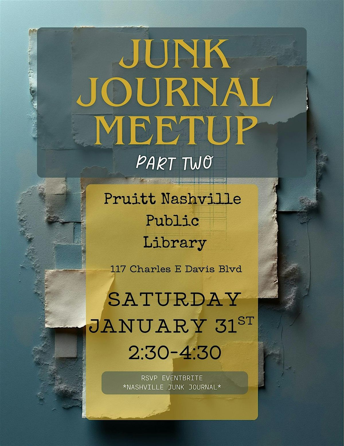 Welcome to the Nashville Junk Journal Pt. 2 event at Nashville Public Library Pruitt Branch! Join us on January 31, 2026 at 2:30 PM (Central Time) for a fun and creative journaling session. Bring your old papers, photos, and trinkets to create a unique journal filled with memories. Let's get crafty and have a blast together! See you there!